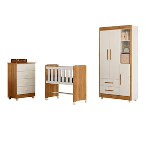 Miniberço para uso, principalmente durante o resguardo, para bebês que ainda não sentam, ajoelha e levantam sozinhas, pode ser levado de um ambiente ao outro sem a necessidade de desmontar. Fabricado em 100% MDF com sistema de fixação por buchas internacionais, acompanha kits rodízios. Acabamento acetinado. Colchão D18 incluso. Cômoda com 4 gavetas. Possui corrediças metálicas telescópicas. Acabamento acetinado. Fornecido com o jogo de pés que permitem passagem de ventilação por baixo do móvel, facilitando a limpeza e evitando acúmulo de pó e pelos. Roupeiro com 3 portas e 2 gavetas. Possui 1 cabideiro, 5 prateleiras. Dobradiças metálicas de pressão. Corrediças telescópicas. Produto com ótima divisão interna. Possui jogo de pés que permitem passagem de ventilação por baixo do móvel. Acabamento da Gaveta: Pintura UV Acabamento da Porta: Pintura UV Acompanha Manual de Instalação: Sim Acompanha Suporte para Mosquiteiro: Sim - Sem Véu Ambiente Principal: Quarto de Bebê Certificado: BER-619/2017-6 codigo_ean: 7909903373446 Complexidade da Montagem: Alta: deve ser montado por um montador especializado Cor: Amadeirado/Branco Cor do Produto: Amadeirado/Branco Cor Interna: Branco Escala de Brilho: Fosco Escala de Brilho da Gaveta: Fosco Escala de Brilho da Porta: Fosco Escala de Brilho da Prateleira: Fosco Estampado: Não Estrado com Regulagem de Altura: Não Estrado Regulável em Quantas Posições: 03 Linha ou Coleção: Lila Manual de Montagem e Instalação: https://product-hub-prd.madeiramadeira.com.br/861894/documents/8b619ad9-ed06-4986-8798-12728767c3ac1435337conjuntolila.pdf Material da Gaveta: MDF Material da Porta: MDF Material da Prateleira: MDF Material do Estrado: MDF Material do Fundo: HDF Material do Puxador da Gaveta: MDF Material do Puxador da Porta: MDF Material Principal: MDF Medida de Cada Item: Berço; Altura: 88,5cm Largura: 94cm Profundidade: 45cm Cômoda; Altura: 96cm Largura: 64cm Profundidade: 39cm Roupeiro; Altura: 187cm Largura: 90cm Profundidade: 40cm Necessita Montagem: Sim Origem do Produto: Nacional Permite a Utilização de Cama Auxiliar: Não Peso: 98.0000 Peso de Cada Item: 17kg / 23kg / 0,7kg / 58kg Pintura Atóxica: Sim Possui Certificado: Sim Possui Gavetas: Sim Possui Grade: Sim Possui Portas: Sim Possui Prateleiras: Sim Possui Rodízio: Sim Possui Trocador: Não Quantidade de Gavetas: 06 Quantidade de Portas: 03 Quantidade de Prateleiras: 05 Recomendações de Uso, Manutenção e Limpeza: Limpar com pano macio e levemente umedecido. Não utilizar solventes a base e de inflamáveis. Não utilizar produtos abrasivos. Sistema de Montagem: Parafusos e Cavilhas. Suporta Até (kg): 140.0000 Tipo de Corrediça da Gaveta: Metálica Telescópica Tipo de Dobradiça/Corrediça da Porta: Metálica Tipo de Grade: Fixa Tipo de Guarda-Roupa: Infantil Tipo de Porta: Bater Tipo de Puxador da Gaveta: Externo Tipo de Puxador da Porta: Externo