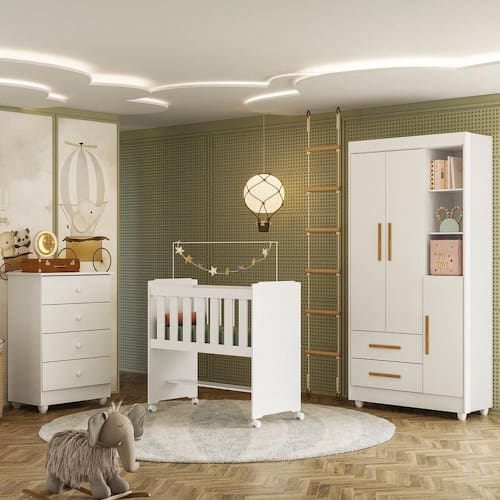 Quarto de Bebê Completo com Cômoda, Mini Berço com Colchão e Guarda Roupas Lila Branco. Miniberço para uso, principalmente durante o resguardo, para bebês que ainda não sentam, ajoelha e levantam sozinhas, pode ser levado de um ambiente ao outro sem a necessidade de desmontar. Fabricado em 100% MDF com sistema de fixação por buchas internacionaiss, acompanha kits rodízios. Acabamento acetinado. Colchão D18 incluso. Cômoda com 4 gavetas. Possui corrediças metálicas telescópicas. Acabamento acetinado. Fornecido com o jogo de pés que permitem passagem de ventilação por baixo do móvel, facilitando a limpeza e evitando acúmulo de pó e pelos. Roupeiro com 3 portas e 2 gavetas. Possui 1 cabideiro, 5 prateleiras. Dobradiças metálicas de pressão. Corrediças telescópicas. Produto com ótima divisão interna. Possui jogo de pés que permitem passagem de ventilação por baixo do móvel.