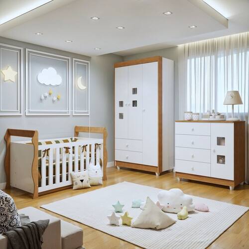 O Quarto de Bebê Completo Bibi traz conforto e funcionalidade para o cantinho do seu bebê. Com um design elegante e prático, o conjunto inclui um guarda-roupa espaçoso, perfeito para organizar as roupinhas, um berço seguro e confortável, e uma cômoda com amplas gavetas para facilitar o armazenamento dos itens essenciais do bebê. Este quarto combina qualidade e sofisticação, proporcionando um ambiente acolhedor para o seu bebê crescer com estilo e bem-estar.