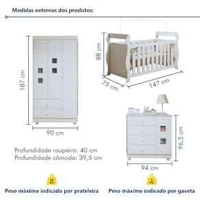 Sim, a acomodação tem amplas gavetas que ajudam a organizar as roupas e acessórios do bebê de forma prática. Acabamento da Gaveta: Pintura Acabamento da Porta: Pintura Acompanha Manual de Instalação: Sim Altura do Conjunto: 187 cm Ambiente Principal: Quarto de Bebê Certificado: OCAN-BER.278/19-3 Certificado INMETRO (código): OCAN-BER.278/19-3 codigo_ean: 7900288080639 Complexidade da Montagem: Alta: deve ser montado por um montador especializado Cor: Branco Cor do Produto: Branco Cor Interna: Branco Escala de Brilho: Semi-Brilho Escala de Brilho da Gaveta: Semi-Brilho Escala de Brilho da Porta: Semi-Brilho Escala de Brilho da Prateleira: Semi-Brilho Estrado com Regulagem de Altura: Sim Estrado Regulável em Quantas Posições: 03 Largura do Conjunto: 147 cm Linha ou Coleção: Bibi Manual de Montagem e Instalação: https://cdn2.madeiramadeira.com.br/atributo/tigus-baby/2715492-732-1740591154457.pdf Marca: Tigus Baby Material da Gaveta: MDF Material da Porta: MDF Material da Prateleira: MDF Material do Estrado: MDF Material do Fundo: MDF Material do Puxador da Gaveta: MDF Material do Puxador da Porta: MDF Material Principal: MDF Medida de Cada Item: Medida do Berço: 75cmx147cmx88cm Cômoda; 96cmx94cmx39 upa; 163cmx90cmx40cmGuarda Ro modular: Sim Necessita Montagem: Sim O Conjunto Contém: Berço/Guarda-Roupa/Cômoda Origem do Produto: Nacional Peso: 116 Peso de Cada Item: Berço; 30kg Cômoda; 33kg e Guarda Roupa; 53kg Porta Janelada: Não Possui Certificado: Sim Possui Espelhos: Não Possui Gavetas: Sim Possui Portas: Sim Possui Prateleiras: Sim Possui Rodízio: Não Possui Trocador: Não Profundidade do Conjunto: 75 cm Quantidade de Gavetas: 06 Quantidade de Portas: 04 Quantidade de Prateleiras: 03 Recomendações de Uso, Manutenção e Limpeza: Limpar com pano macio e levemente umedecido. Não utilizar solventes a base e de inflamáveis. Não utilizar produtos abrasivos. Sistema de Montagem: Parafusos. Suporta Até (kg): 100 Tipo de Corrediça da Gaveta: Metálica Telescópica Tipo de Dobradiça/Corrediça da Porta: Metálica Tipo de Porta: Bater Tipo de Puxador da Gaveta: Externo Tipo de Puxador da Porta: Externo