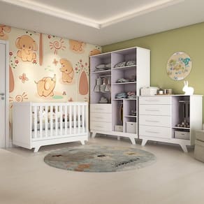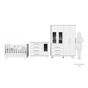 Quarto de Bebê Completo com Guarda Roupa com Janela Berço e Cômoda 100% MDF Retrô Kakau Espresso Móveis Branco/Brilho. Inspirado no estilo retrô do passado com um toque de modernidade a linha Kakau é encantadora. O berço é certificado pelo INMETRO no registro 000781/2018, tem a opção de ser utilizado como mini cama, acompanha um suporte para mosquiteiro e a base do colchão é regulável em 3 opções de altura, aumentando o conforto no uso diário e na segurança com o crescimento do seu pequeno(a). São móveis com acabamento em pintura UV atóxica e com a qualidade de ser produzido em 100% MDF. As gavetas possuem corrediças telescópicas e suportam até 4kg cada. Tudo para oferecer um quartinho aconchegante, pratico e lindo para o seu bebê. Medidas dos produtos (cm): Berço: 92,20 x 135,50 x 76,30 (AxLxP) Cômoda: 104,80 x 118,60 x 50 (AxLxP) Guarda Roupa: 209,60 x 154,80 x 49,80 (AxLxP) Ean: 7908161542199