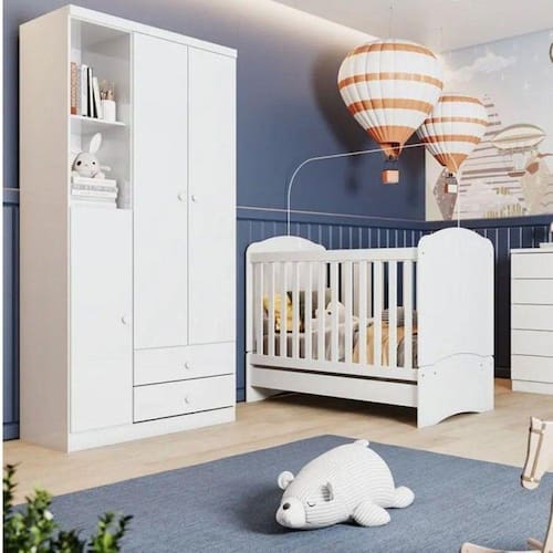 Esse lindo Quarto de bebê Completo é tudo o que você pediu em um único ambiente. Toda essa combinação foi pensada para que este conjunto permaneça em sua casa por muitos anos acompanhando o crescimento de seus pequenos. O Berço Mini Cama traz todo o conforto e a segurança que seu bebê precisa para dormir tranquilo. Produzido em MDP, a sustentação possui revestimento interno e externo com pintura UV, esse revestimento assegura durabilidade ao móvel. Além de suas funcionalidades como, estrado com regulagem de altura, mosquiteiro, o berço se transforma em Sofá-cama e Mini-cama. O Roupeiro possui 3 portas e 2 Gavetas externas com corrediças metálicas que permite um deslize mais seguro e suave. Possui Rodízio: Não Acompanha Colchão: Não Altura do Conjunto: 180.5 cm Ambiente: Quarto de Bebê Ambiente Principal: Quarto de Bebê Cor: Branco Estrado com Regulagem de Altura: Sim Informação Complementar: 1x Berço Mini Cama Bala de Menta BrancoLargura: 132 cmAltura: 101 cmPeso: 31 kgProfundidade: 68 cmNecessita Montagem: Sim1x Guarda Roupa 3 Portas Bala de Menta Cor Flex Branco ou Branco/Rosa CháLargura: 91 cmAltura: 180,5 cmPeso: 45 kgProfundidade: 40 cmNecessita Montagem: Sim Permite a Utilização de Cama Auxiliar: Não Pintura Atóxica: Sim Suporta Até (kg): 25 kg Tamanho: