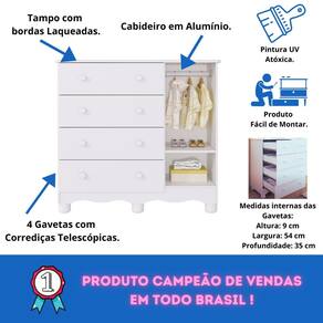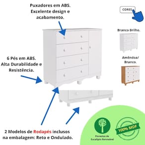 -Cômoda Infantil Junior Altura: 88 cm Largura: 95,3 cm Profundidade: 42 cm Quantidade de Gavetas: 04 Gavetas ( Peso suportado 4Kg) Quantidade de Portas: 01 Porta Material: 100% MDF Cores disponíveis: Branco Brilho, Amêndoa/Branco. Acabamento do Produto: Pintura UV Atóxica/ Pintura PU e Fita de Bordo Tipo de Corrediça: Corrediça Telescópica Tipo de Cabideiro: Cabideiro Metálico Tipo de Puxadores: Plásticos Tipo de Pés: Plásticos ( Altura 6cm)