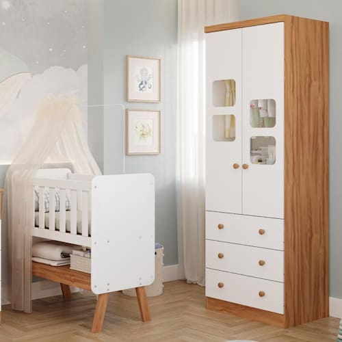 Com um design harmonizado, esse quarto de bebê Composto por um Mini Berço Faura e o Guarda Roupa Uli, oferece beleza, qualidade e segurança. A opção compacta do conjunto facilita a organização, tornando sua rotina diária mais agradável. Você poderá desfrutar de um espaço funcional para cuidar do seu bebê sem abrir mão do estilo.
