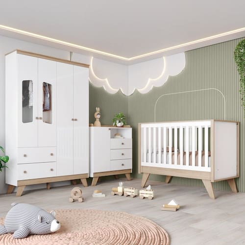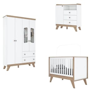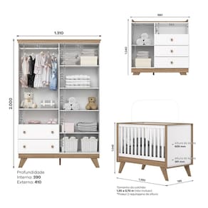 - A Cômoda pode ser usada como trocador na parte de cima. Acompanha Colchão: Não Acompanha Manual de Instalação: Sim Altura do Conjunto: 200 cm Ambiente Principal: Quarto de Bebê Certificado: 002 114/2023 Certificado INMETRO (código): 002 114/2023 codigo_ean: 7900288246165 Complexidade da Montagem: Média: pode ser montado por mais de uma pessoa e/ou necessite de maior conhecimento para montagem Cor: Branco/Jequitibá Cor do Produto: Branco/Jequitibá Cor Interna: Trama Branco (Branco Acinzentado) Escala de Brilho: Fosco Estrado com Regulagem de Altura: Sim Estrado Regulável em Quantas Posições: 02 Formato da Janela da Porta: Retângulo Largura do Conjunto: 139 cm Linha ou Coleção: Noah Manual de Montagem e Instalação: https://product-hub-prd.madeiramadeira.com.br/415974379/documents/c9d0dfff-90dc-4040-85fb-0453e70b37d93244335326617591491089864.pdf Marca: Espresso Móveis Material da Gaveta: MDF/MDP Material da Porta: MDF/MDP Material da Prateleira: MDF/MDP Material do Estrado: MDF/MDP Material do Fundo: MDF/MDP Material do Puxador da Gaveta: Madeira Maciça Material Principal: MDF/MDP Medida de Cada Item: Guarda Roupas: 200 x 131 x 41cm ; Berço: 139 x 104,5 x 78,5cm ; Cômoda: 104 x 98 x 41cm modular: Não Necessita Montagem: Sim Origem do Produto: Nacional Peso: 135.0000 Peso de Cada Item: Guarda Roupas: 48kg; Berço: 31kg; Cômoda: 29kg Porta Janelada: Sim Possui Certificado: Sim Possui Espelhos: Não Possui Gavetas: Sim Possui Portas: Sim Possui Prateleiras: Sim Possui Rodízio: Não Profundidade do Conjunto: 78,5 cm Quantidade de Gavetas: 05 Quantidade de Prateleiras: 06 Recomendações de Uso, Manutenção e Limpeza: Para limpeza de seu móvel, use uma flanela limpa e seca. Não utilize produtos químicos que possam danificar o produto. Sistema de Montagem: Parafusos e Cavilhas Tamanho do Colchão Indicado (L x C): 130 x 70cm Tipo de Corrediça da Gaveta: Metálica Telescópica Tipo de Dobradiça/Corrediça da Porta: Metálica Tipo de Puxador da Gaveta: Externo