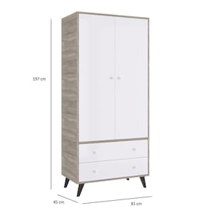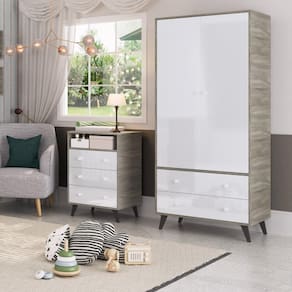 Quarto de Bebê Completo Roupeiro 2 Portas 2 Gavetas com Cômoda 3 Gavetas 1 Nicho Nuvem Móveis Percasa Fresno/Branco. O Quarto de Bebê Retrô Nuvem é composto por um roupeiro de 2 portas e 2 gavetas, e uma comoda com 3 gavetas e um nicho na cor fresno com branco. Os pés são em madeiras, e as corrediças são telescópicas. Pode ser utilizado em um quarto amplo, ou em um menor.