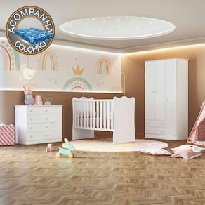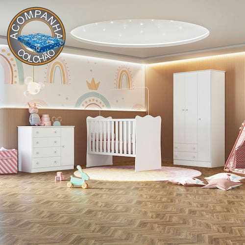 Características Estrutura em MDP Acabamento em pintura UV Atóxica Grades de proteção fixas feitas em MDF Estrado em MDF com 3 opções de altura Acompanha suporte para mosquiteiro ACOMPANHA COLCHÃO 130 X 60 Suporta até 40 kg. 04 Portas articuladas 06 Gavetas externas Cabideiro oblongo metálico Dobradiças e corrediças metálicas Puxadores em plástico poliestireno com formato de estrela Acabamento das bordas em perfil PVC Amplo espaço interno com prateleiras Sistema anti-tombamento para evitar riscos de acidentes.