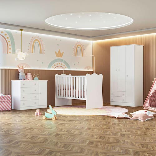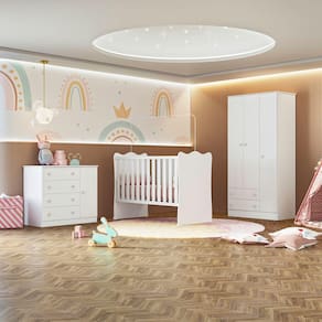 Características Estrutura em MDP Acabamento em pintura UV Atóxica Grades de proteção fixas feitas em MDF Estrado em MDF com 3 opções de altura Acompanha suporte para mosquiteiro Colchão não está Incluso - Ideal para colchão de 130 x 60 cm Suporta até 40 kg. 04 Portas articuladas 06 Gavetas externas Cabideiro oblongo metálico Dobradiças e corrediças metálicas Puxadores em plástico poliestireno com formato de estrela Acabamento das bordas em perfil PVC Amplo espaço interno com prateleiras Sistema anti-tombamento para evitar riscos de acidentes.