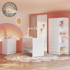 Características Estrutura em MDP Acabamento em pintura UV Atóxica Grades de proteção fixas feitas em MDF Estrado em MDF com 3 opções de altura Acompanha suporte para mosquiteiro Acabamento das bordas em perfil PVC ACOMPANHA COLCHÃO 130 X 60 Suporta até 40 kg. 02 Portas articuladas 07 Gavetas externas Roupeiro com cantoneiras laterais acopladas Amplo espaço interno com prateleiras Cabideiro oblongo metálico Dobradiças e corrediças metálicas Puxadores em plástico poliestireno com formato de estrela Sistema anti-tombamento para evitar riscos de acidentes.