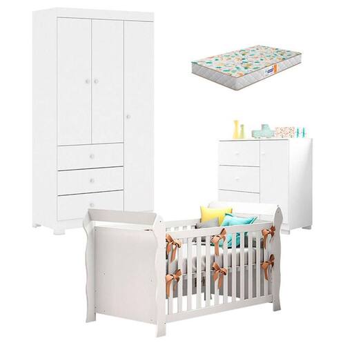 Quarto de Bebê Duda 3 Portas e Berço Americano Lara Branco Brilho com Colchão Gazin – Phoenix Baby