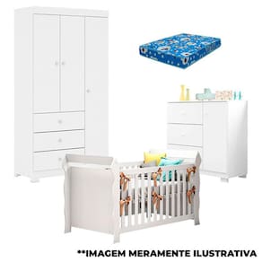 Quarto de Bebê Duda 3 Portas e Berço Americano Lara Branco Brilho com Colchão – Phoenix Baby