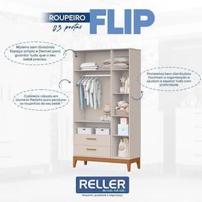 O Quarto de Bebê Flip da Reller é a escolha ideal para quem busca praticidade, beleza e conforto em um só conjunto. Com design moderno o kit com Roupeiro moderno é composto por um berço seguro e funcional, desenvolvido dentro das normas de qualidade, que garante noites tranquilas e acolhedoras. A cômoda gaveteiro oferece amplo espaço interno, equipada com corrediças telescópicas que proporcionam abertura suave, além de puxadores em MDF revestido e pés em madeira. Desenvolvido pela Reller com toda praticidade.