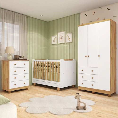 Crie um ambiente encantador e funcional com este quarto de bebê completo 100% MDF, desenvolvido para oferecer segurança, conforto e estilo. O berço certificado pelo INMETRO possui regulagem de altura e pode ser transformado em minicama, ou minisofá, ou escrivaninha, acompanhando o crescimento do bebê. O Guarda-roupas e cômoda possuem corrediças telescópicas que garantem abertura suave e durabilidade nas gavetas e 1 cabideiro metálico, para maximizar a organização da sua rotina. Com design clássico moderno e acabamento delicado, o conjunto traz um toque de leveza e elegância ao espaço infantil.
