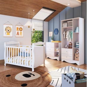 Proposta desenvolvida para oferecer qualidade, beleza, conforto e segurança para toda família na hora de montar o quartinho do(a) bebê. Produtos estrurados em 100% MDF e com acabamento em pintura UV atóxica. O berço possui padrão de colchão americano, estrado com altura regulável e todas as bordas arredondadas e laqueadas, que proporcionam mais segurança e uma sensação agradável ao toque, além de pode ser utilizado como mini cama ou mini sofá, prolongando seu uso. Já o guarda roupas e a cômoda possuem gavetas que deslizam suavemente por corrediças telescópicas, facilitando a abertura, cabideiro metálico e algumas prateleiras que são ideais para acomodar as peças com organização da sua preferência. Também acompanham os produtos, 2 opções de rodapés, um usinado (torneado) e outro retrô, para que você escolha no momento da montagem qual se adequa ao estilo do ambiente. Aproveite para adquirir o seu agora!