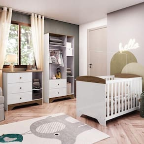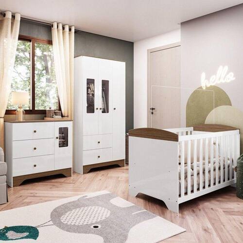 Proposta desenvolvida para oferecer qualidade, beleza, conforto e segurança para toda família na hora de montar o quartinho do(a) bebê. Produtos estrurados em 100% MDF e com acabamento em pintura UV atóxica. O berço possui padrão de colchão americano, estrado com altura regulável e todas as bordas arredondadas e laqueadas, que proporcionam mais segurança e uma sensação agradável ao toque. Já o guarda roupas e a cômoda possuem gavetas que deslizam suavemente por corrediças telescópicas, facilitando a abertura, cabideiro metálico e algumas prateleiras que são ideais para acomodar as peças com organização da sua preferência. Também acompanham os produtos, 2 opções de rodapés, um usinado (torneado) e outro retrô, para que você escolha no momento da montagem qual se adequa ao estilo do ambiente. Aproveite para adquirir o seu agora! Ambiente composto por: - 1 Guarda Roupa Infantil 3 Portas com Janelas Retangulo e 2 Gavetas 100% MDF 194,5 x 92,9 x 42 (AxLxP - cm) - 1 Cômoda Infantil 1 Porta Janelas Retangulo 3 Gavetas 100% MDF 89,4 x 92,9 x 42 (AxLxP - cm) - 1 Berço Americano 100% MDF 85 x 133 x 76 (AxLxP - cm) Ambiente Principal: Quarto de Bebê codigo_ean: 7909903356913 Cor: Branco Brilho/Carvalho Estrado com Regulagem de Altura: Sim Informação Complementar: 1x Guarda Roupa Infantil 3 Portas com Janelas Retangulo e 2 Gavetas 100% MDF Cocada Branco Brilho/CarvalhoLargura: 92,9 cmAltura: 194,5 cmPeso: 53,93 kgProfundidade: 42 cmNecessita Montagem: Sim1x Cômoda Infantil 1 Porta com Janela Retangulo e 3 Gavetas 100% MDF Cocada Branco Brilho/CarvalhoLargura: 92,9 cmAltura: 89,4 cmPeso: 34,2 kgProfundidade: 42 cmNecessita Montagem: Sim1x Berço Americano 100% MDF Ayla Branco/CarvalhoLargura: 133Altura: 85Peso: 2763Profundidade: 76Necessita Montagem: Sim Material Principal: MDF Permite a Utilização de Cama Auxiliar: Não Pintura Atóxica: Sim Possui Rodízio: Não