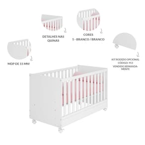 Caracteristicas do Berco: Marca: Qmovi Modelo: Doce Sonho Registro INMETRO: 007 190/2017 Material: MDP 15/DF Acabamento: Pintura UV Escala de Brilho: Brilho/Toque Fosco Berco padrao nacional -60cm- Medida para colchao: 60cm x 130cm Grades fixas feitas em MDF de 12mm e 25mm Acabamento das bordas em perfil PVC Estrado em MDF de 6mm e travessas em MDF de 25mm Peso suportado: 40Kg -Distribuidos e sem impactos-