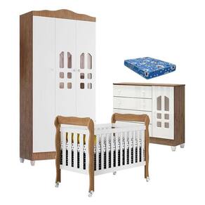 Quarto de Bebê New Selena 3 Portas com Berço Lila e Cômoda Selena Branco Acetinado Amadeirado e Colchão Ortobom – Carolina Móveis
