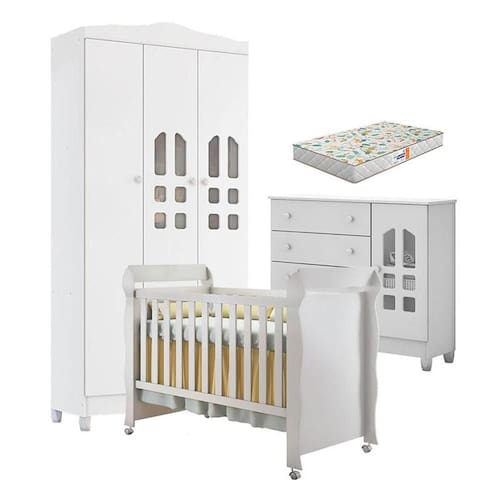 Quarto de Bebê New Selena 3 Portas com Cômoda Selena e Berço Mirelle Branco Brilho e Colchão Gazin – Carolina Móveis