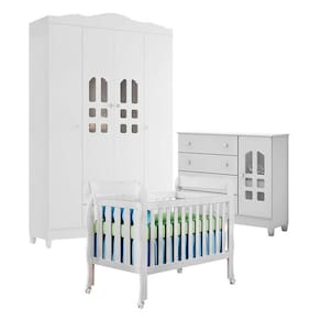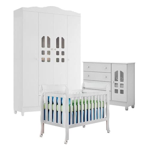 Quarto de Bebê New Selena 4 Portas com Berço Lila e Cômoda Selena Branco Brilho – Carolina Móveis