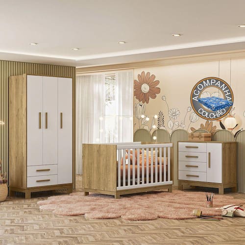 Características Estrutura em MDP Acabamento em pintura UV Acetinada Atóxica Grades de proteção fixas feitas em MDF Estrado em MDF regulável em três alturas Acompanha suporte para mosquiteiro Berço 2 em 1 - Pode ser montado no modelo Mini Cama Suporta até 40 kg. ACOMPANHA COLCHÃO 130 X 70 04 Portas articuladas 06 Gavetas externas Prateleiras internas com amplo espaço Cabideiro oblongo metálico Gavetas com corrediças netálicas Puxadores duplos de 250mm em MDF Portas com dobradiças metálicas Pés em MDF de 25mm Sistema anti-tombamento para evitar riscos de acidentes.