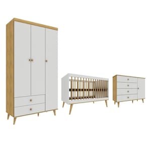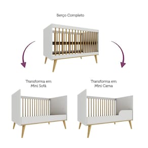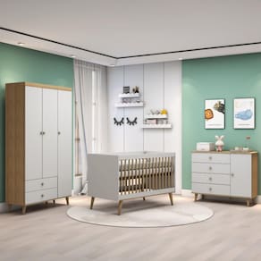 Um dormitório no estilo retrô para deixar o ambiente ainda mais encantador. Produzidos em MDP/MDF de alta resistência mecânica e os pés palitos de madeira maciça, esses móveis são todos rigidamente testados em laboratório e certificados pelo INMETRO. O berço multifuncional também serve como mini-cama e mini-sofá, o guarda-roupa e a cômoda contam com corrediças telescópicas em suas gavetas, trazendo mais segurança e leveza às peças.