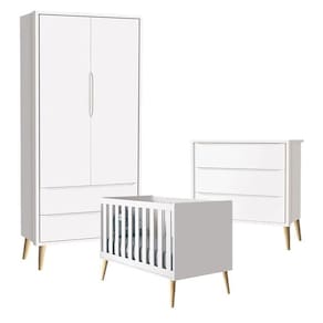Quarto de Bebê Theo 2 Portas com Cômoda Gaveteiro Branco Acetinado Pés Madeira Natural - Reller