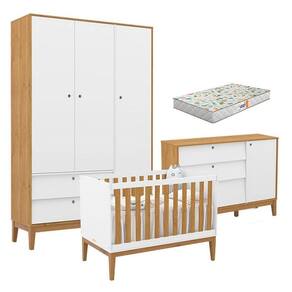 Quarto de Bebe Unique 3 Portas com Cômoda Sapateira Branco Soft Freijó Eco Wood e Colchão Gazin - Matic