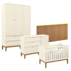 Quarto de Bebê Unique 3 Portas com Cômoda Sapateira e Painel Ripado com Led Off White Eco Wood - Matic