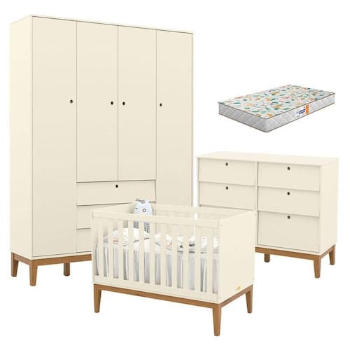 Quarto de Bebe Unique 4 Portas com Cômoda 6 Gavetas Off White Eco Wood e Colchão Gazin - Matic