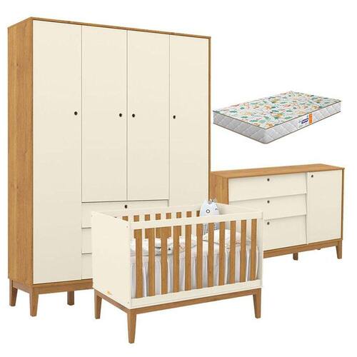 Quarto de Bebe Unique 4 Portas com Cômoda Sapateira Off White Freijó Eco Wood e Colchão Gazin - Matic