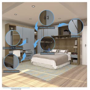 Informações Complementares: Dobradiças reforçadas. Guarda Roupa de Canto necessita de recuo para montagem. Verifique a planta baixa. Alguns módulos podem ser montados com abertura para o lado Direito ou Esquerdo. Consulte o manual de montagem. Cadeira não acompanha o ambiente, a imagem é meramente ilustrativa.