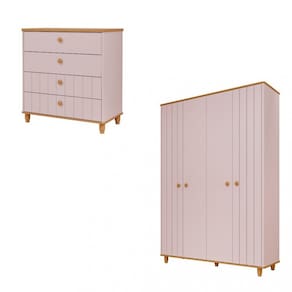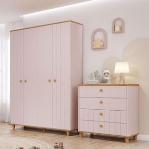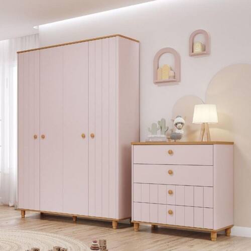 Quarto de Infantil Completo Guarda Roupa 4 Portas e Cômoda 4 Gavetas 100 MDF Lívia Permobili - Rosa Claro