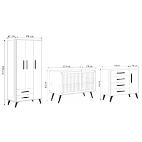 O Guarda Roupa 3 Portas oferece amplo espaço interno com divisórias bem distribuídas, ideal para organizar roupas e acessórios de forma eficiente. O design elegante adiciona um toque de sofisticação ao espaço, enquanto os detalhes cuidadosamente acabados garantem durabilidade. A Cômoda Infantil complementa o conjunto com quatro gavetas espaçosas, equipadas com corrediças metálicas assim como o guarda roupa, proporcionam um deslizar suave e silencioso, enquanto os puxadores de design moderno adicionam um toque extra de sofisticação e estilo retrô. O acabamento em pintura UV destaca as cores, criando um ambiente acolhedor e atrativo para o quarto. O Berço Padrão Americano, oferece conforto e essencial para o bebê. O ajuste de altura do estrado em três níveis, com grade removível transformando-o em mini cama que permite que os pais escolham a configuração ideal à medida que seu filho cresce. Além disso, a inclusão de um suporte para mosqueteiro oferece proteção adicional contra insetos, garantindo um sono tranquilo e sem interrupções para o bebê. O conjunto é ideal para quem deseja unir praticidade na decoração do quarto infantil, criando um ambiente organizado que inspira brincadeiras e tranquilidade.