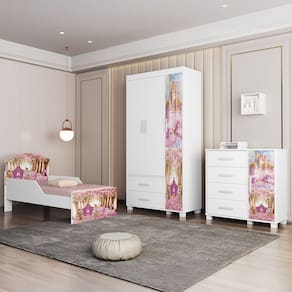 Para completar, a Cômoda Infantil com quatro gavetas e uma porta oferece espaço de sobra para manter tudo no lugar. Funcional e linda, ela acompanha a mesma temática alegre e colorida, criando um conjunto harmonioso que vai conquistar pais e filhos. É o quartinho dos sonhos pronto para ser vivido!