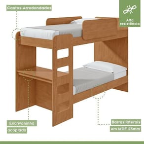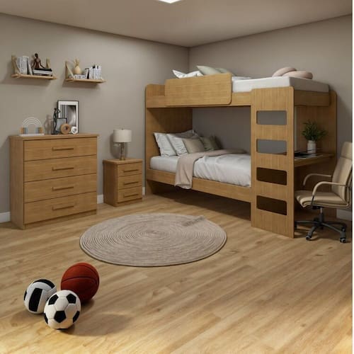 Ideal para a decoração de quarto infantil, este conjunto combina segurança, organização e praticidade. O beliche, com seu design divertido e bordas seguras, oferece um espaço aconchegante para dormir e uma escrivaninha perfeita para as aventuras dos estudos. A cômoda e a mesa de cabeceira, com suas gavetas espaçosas, mantêm brinquedos, roupas e livros sempre organizados. Feitos com materiais duráveis, nossos móveis acompanham o crescimento dos pequenos, garantindo um quarto infantil cheio de estilo, diversão e funcionalidade.