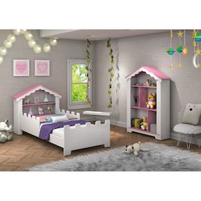 O jogo de quarto magia foi pensado e desenvolvido para agregar na decoração do quartinho, a estante magia além de ser um móvel de fácil acesso para as crianças da um ar sofisticado e de organização no quartinho, seu acabamento em formato de casinha encanta a todos e deixa a decoração do ambiente perfeita e é ideal para a organização de livros, brinquedos e objetos decorativos.Já A cama juvenil Magia tem o objetivo de levar os sonhos de suas pequenas para os contos de fada e é perfeita para o quarto da sua filha, com design inovador ela foi projetada para oferecer conforto e segurança para a criança, suas laterais possuem barras de proteção em formato de castelo que além de dar um toque super delicado tem a finalidade de evitar quedas, possui prateleiras e nichos na cabeceira para guardar brinquedos ou decorações e é produzida em mdf para oferecer maior qualidade e resistência.(Não Acompanha Colchão)O Kit Contém: 01 Cama Juvenil Magia01 Estante MagiaManual De Instruções para MontagemDimenções dos Produtos:Estante MagiaAltura:118 cmLargura:85 cmProfundidade:23,6 cmProduzido em MdfPés de plástico com regulagem de alturaCama MagiaAltura: 85 cmLargura: 85 cmProfundidade:173 cm02 PrateleirasBarras De Proteção LateralCabeceira em Formato de Casinha(Não Acompanha Colchão) OBS:Os produtos são entregues desmontados, recomendamos que a montagem seja feita por um profissional. A montagem é de total responsabilidade do cliente, nós não oferecemos esse serviço!As imagens são meramente ilustrativas e editadas, podendo ter uma variação na cor de acordo com a tela ou monitor de cada cliente , os objetos e brinquedos que compõem as imagens não acompanham o produto.