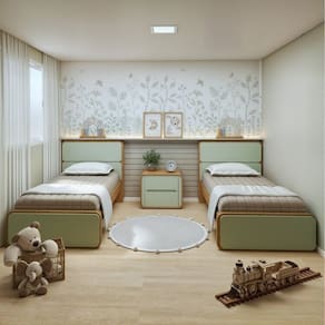 Desperte a magia com nosso conjunto de móveis para quarto infantil! Com bordas arredondadas e uma cabeceira estofada, as 2 camas são perfeitas para noites de sono tranquilas. A mesa de cabeceira, com suas gavetas espaçosas, são ideais para guardar livros, brinquedos e segredos preciosos. Este conjunto é a combinação perfeita de funcionalidade e estilo, criando um ambiente acolhedor e organizado onde as crianças podem brincar, dormir e crescer feliz!
