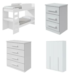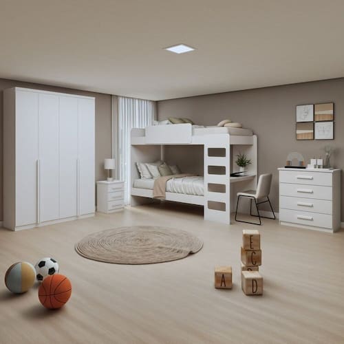 Com um design acolhedor e seguro, este beliche é o palco perfeito para sonhos incríveis. A escrivaninha de estudo acoplada é um cantinho especial para desenhar e aprender, enquanto a cômoda é uma verdadeira caixa de tesouros para guardar brinquedos e roupas. A mesa de cabeceira é ideal para o livro de histórias da boa noite e a lanterna mágica, e o guarda-roupa gigante acomoda todas as fantasias e roupas dos pequenos. Cada dia é uma nova aventura e cada noite é um sonho encantado!