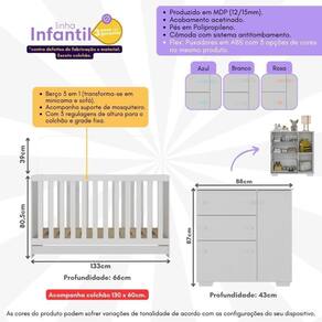 Dimensões do produto montado: Berço - Altura: 80,5cm | Largura: 133cm | Profundidade: 66cm Colchão - Altura: 10cm | Largura: 130cm | Profundidade: 60cm Cômoda - Altura: 87cm | Largura: 88cm | Profundidade: 43cm *Você pode consultar as medidas detalhadas na imagem técnica do produto.