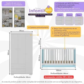 Dimensões do produto montado: Berço - Altura: 80,5cm | Largura: 133cm | Profundidade: 66cm Colchão - Altura: 10cm | Largura: 130cm | Profundidade: 60cm Guarda-Roupas - Altura: 189cm | Largura: 90cm | Profundidade: 42cm *Você pode consultar as medidas detalhadas na imagem técnica do produto.