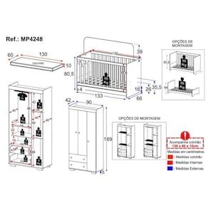 Dimensões do produto montado: Berço - Altura: 80,5cm | Largura: 133cm | Profundidade: 66cm Colchão - Altura: 10cm | Largura: 130cm | Profundidade: 60cm Guarda-Roupas - Altura: 189cm | Largura: 90cm | Profundidade: 42cm *Você pode consultar as medidas detalhadas na imagem técnica do produto.