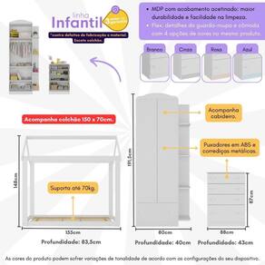 O Quarto Infantil com Cama Montessoriana e Colchão Incluso João e Maria Multimóveis MX4266 é a solução perfeita para criar um ambiente funcional, seguro e encantador no quarto das crianças. Produzido em MDP com acabamento acetinado (cerca de 20% de brilho), o conjunto combina qualidade, durabilidade e um toque de estilo. A cama infantil suporta até 70kg, com um encantador design em formato de casinha, que não só decora o ambiente, mas também incentiva a imaginação e a diversão das crianças. Seu formato facilita o acesso à cama, promovendo autonomia e conforto. Acompanha colchão D20 macio, tamanho 150x70cm, com tratamento antiácaro e antialérgico, proporcionando noites de sono mais tranquilas e saudáveis. O guarda-roupa possui 2 portas e 1 gaveta, com corrediças metálicas e puxadores em ABS, oferecendo praticidade e resistência. Suas prateleiras externas são perfeitas para organizar brinquedos ou exibir objetos decorativos, ajudando a manter o quarto organizado e charmoso. Acompanha também um cabideiro que suporta até 3kg, ideal para pendurar roupas e acessórios. A cômoda conta com 4 gavetas com corrediças metálicas e puxadores em ABS, oferecendo amplo espaço para organizar roupas e outros itens essenciais. Seu tampo suporta até 7kg, perfeito para pequenos objetos decorativos ou utilitários. Além de seu design encantador e funcional, o guarda-roupa e a cômoda são flex, com detalhes personalizáveis em 4 cores (branco, cinza, rosa e azul), permitindo que você escolha a opção que melhor combina com o estilo e a decoração do quarto. A cômoda e guarda-roupas possuem sistema antitombamento e cantos arredondados, garantindo segurança e proteção para os pequenos.