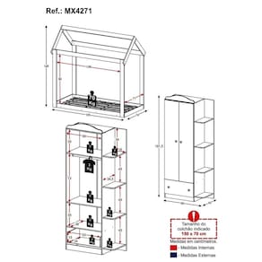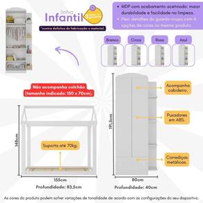 Dimensões do produto montado: Cama - Altura: 148cm | Largura: 155cm | Profundidade: 83,5cm Guarda-roupas - Altura: 191,5cm | Largura: 80cm | Profundidade: 40cm *Você pode consultar as medidas detalhadas na imagem técnica do produto.