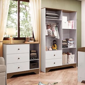 Proposta desenvolvida para oferecer qualidade, beleza, conforto e segurança para toda família na hora de montar o quartinho do(a) bebê. Produtos estrurados em 100% MDF e com acabamento em pintura UV atóxica. O guarda roupas e a cômoda possuem gavetas que deslizam suavemente por corrediças telescópicas, facilitando a abertura, cabideiro metálico e algumas prateleiras que são ideais para acomodar as peças com organização da sua preferência. Também acompanham os produtos, 2 opções de rodapés, um usinado (torneado) e outro retrô, para que você escolha no momento da montagem qual se adequa ao estilo do ambiente. Aproveite para adquirir o seu agora!