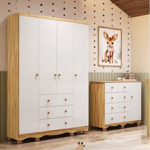 Já o guarda roupas e a cômoda possuem gavetas que deslizam suavemente por corrediças telescópicas, facilitando a abertura, cabideiros metálicos e algumas prateleiras que são ideais para acomodar as peças com organização da sua preferência. Também acompanham os produtos, 2 opções de rodapés, um usinado (torneado) e outro reto, para que você escolha no momento da montagem qual se adequa ao estilo do ambiente.