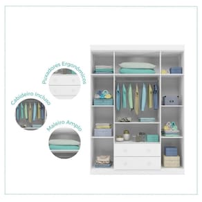 Quarto Infantil com Guarda Roupas e Cômoda Helena Branco. Este lindo Dormitório Helena vai encantar ainda mais o seu ambiente. Projetado para acompanhar todo o desenvolvimento infantil, dispõe de um Roupeiro com 04 Portas e 02 Gavetas além de uma Cômoda com 01 Porta e 04 Gavetas. Produzido 100% em MDP e pintura UV Alto Brilho atóxica proporcionando mais qualidade e durabilidade ao produto. As Corrediças Telescópicas promovem um deslizamento suave, silencioso e muito mais resistente. Há também cabideiros inclusos que favorecem a organização e otimizam o espaço. É sem dúvidas o Conjunto Perfeito para compor o ambiente mais importante do seu bebê com conforto, segurança e delicadeza. Ean: 7909903287095