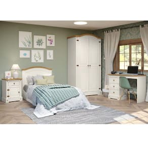 O Quarto Infantil com o Guarda Roupa 2 Portas, Mesa de Cabeceira 1 Gaveta, Cabeceira de Solteiro e Escrivaninha 3 Gavetas da linha Smile vai tornar o quarto do jovem único, agradável e confortável. Os seus diferenciais ficam por conta da composição de MDF junto com elementos em madeira maciça, proporcionando resistência aos seus produtos, e permitindo que as experiências possam ser vivenciadas por mais tempo, além de produtos como a cabeceira e a escrivaninha estimularem uma independência e desenvolvimento da criança. Não deixe de oferecer o melhor para o seu filho/filha e torne essa fase da vida ainda mais especial com a linha Smile. Ambiente Principal: Quarto Infantil Complexidade da Montagem: Média: pode ser montado por mais de uma pessoa e/ou necessite de maior conhecimento para montagem Cor: Creme/Carvalho Cor do Produto: Creme/Carvalho Escala de Brilho: Semi Brilho Linha ou Coleção: Smile Manual de Montagem e Instalação: https://cdn2.madeiramadeira.com.br/atributo/serpil-baby/1105751-conjunto-roupeiro-2p-criado-cabeceira-98-escrivaninha.pdf Material Principal: MDF / Madeira Maciça Medida de Cada Item: Guarda Roupa: 191,2x98,5x55cm / Mesa de Cabeceira: 67,5x53x39,5cm / Escrivaninha: 79x104,5x48cm / Cabeceira: 98,7x98,7x3,3 cm Necessita Montagem: Sim Origem do Produto: Nacional Peso: Guarda Roupa: 73.8kg / Mesa de Cabeceira: 16kg / Escrivaninha: 30.8kg / Cabeceira: 9.8kg Recomendações de Uso, Manutenção e Limpeza: Flanela levemente umedecida Sistema de Montagem: Pregos, Parafusos, Cavilhas e Minifix Suporta Até (kg): Guarda Roupa: 55kg / Mesa de Cabeceira: 20kg / Escrivaninha: 25kg / Cabeceira: 20kg