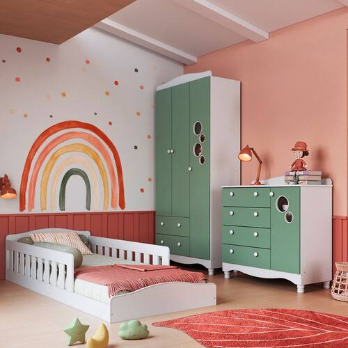 O(a) Quarto Infantil Completo Aquarela 4 Portas 6 Gavetas Branco/Verde - Pnr Móveis é produzido em MDP na escala de brilho Fosco, e possui um grau de dificuldade de montagem: Médio.