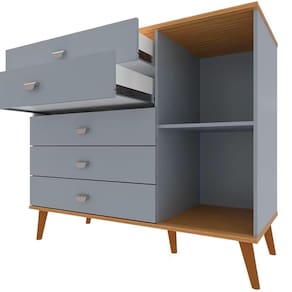 A Cômoda Infantil Bartira Ternura complementa o ambiente com 5 gavetas espaçosas e 1 porta com prateleira interna, perfeita para armazenar objetos maiores ou itens decorativos. Também fabricada em MDP FF, possui corrediças telescópicas que proporcionam abertura suave e silenciosa, além de um visual elegante e funcional.