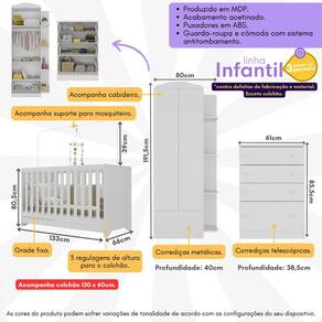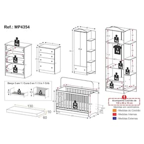 Conteúdo da Embalagem: 1 (um) Berço 1 (um) Colchão 1 (um) Guarda-roupa 1 (uma) Cômoda Manual de Montagem Kit Ferragem